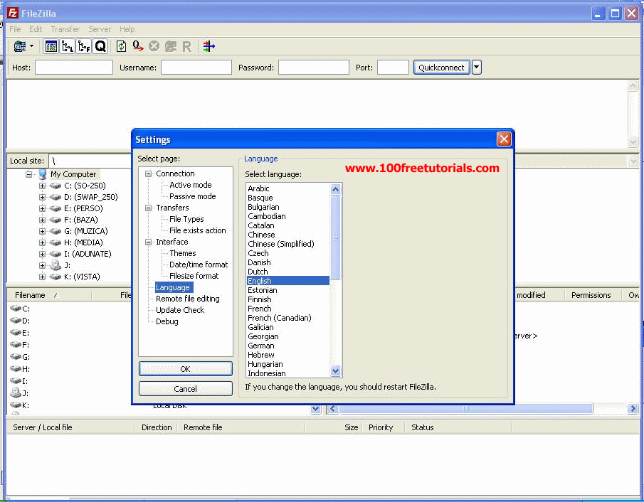 FileZilla is available in many languages. On start, your computer language is automatically selected. If you want to change the language go to